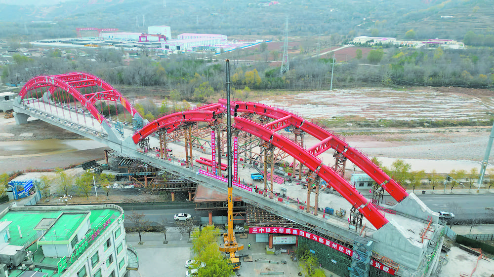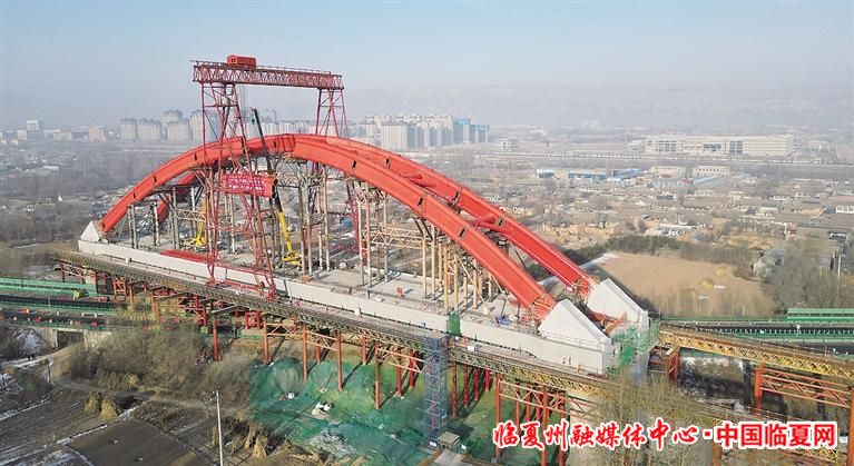 蘭合鐵路臨夏特大橋第二孔96米系桿拱橋鋼管拱順利合龍