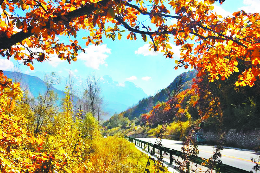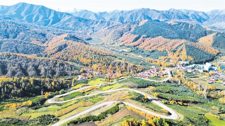 康樂縣八松鄉(xiāng)蜿蜒公路與層林盡染的山林構成了色彩斑斕的美麗畫卷