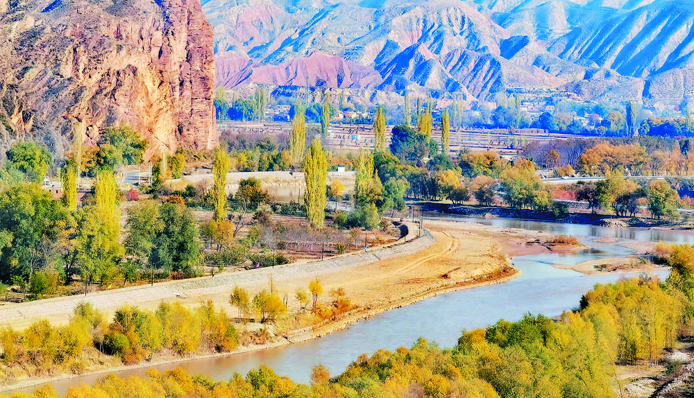11月10日,初冬的永靖縣劉家峽鎮(zhèn)層林盡染,色彩繽紛的樹林將小城裝扮得如詩如畫,美不勝收。 記者 史有東 攝...